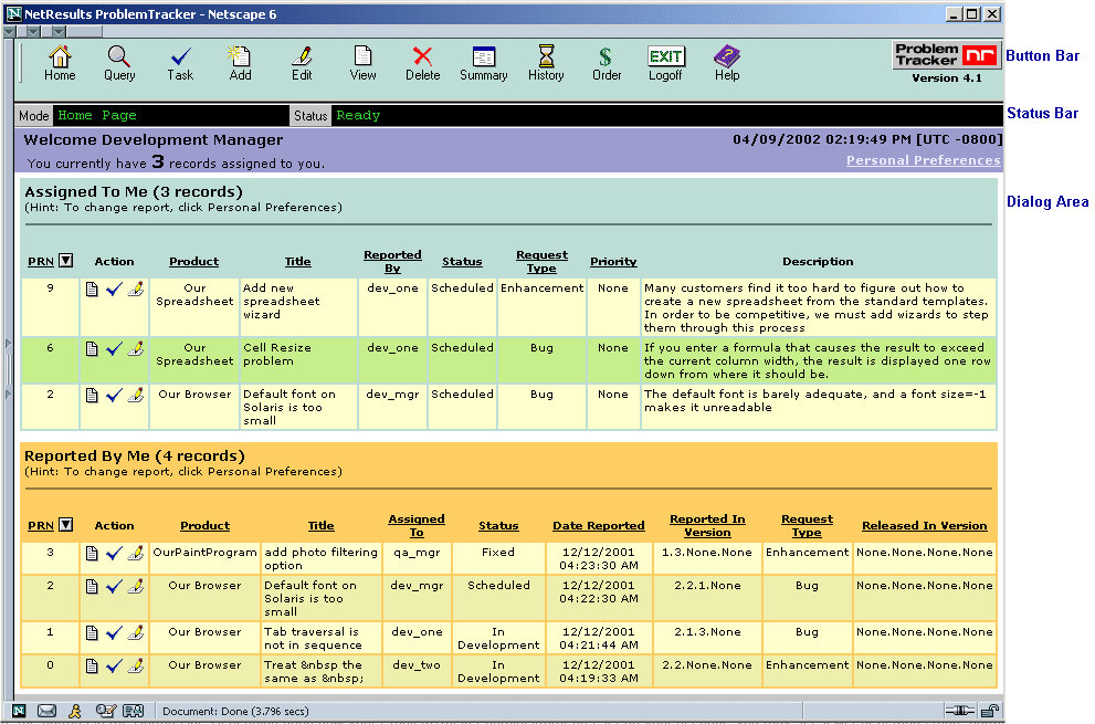 By default, this page has two reports, which display the records assigned to you and the records reported by you. Also present on the Home Page is a link to the personal preferences section, where you can customize various user settings, such as your changing your password and selecting date and report settings.