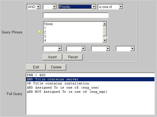 To edit a query phrase that has been inserted into the Full Query section, click on the query phrase, then click on the Edit button. Modify the phrase in the Query Phrase section, then click on the Update button. The query phrase will be updated in the Full Query section.