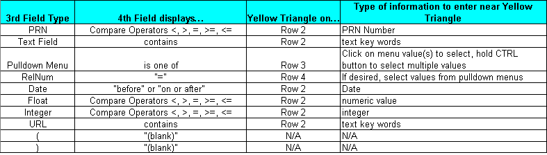 A yellow triangle will appear to the left of the second, third or fourth rows in this section based on the selection made for the third field in the first row. The yellow triangle indicates that more information is needed in that particular row to complete the query phrase. Table 1 describes the type of information that should be entered in rows 2, 3, or 4 based on the selections made in the first row.