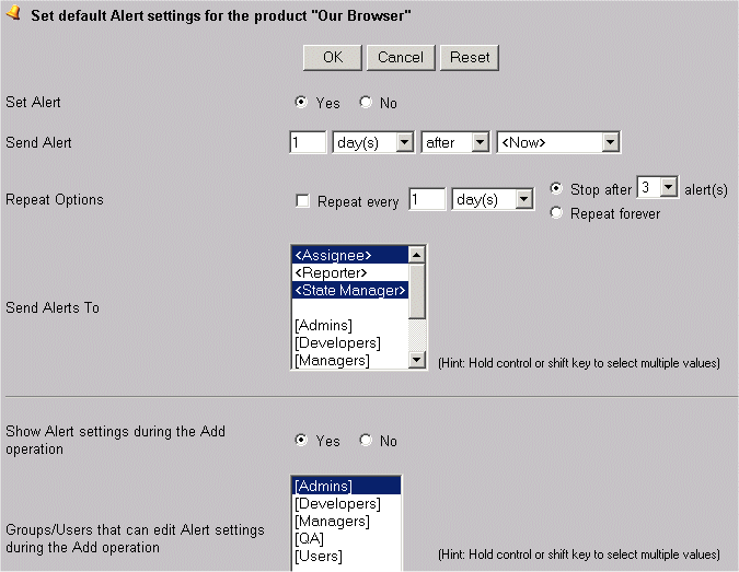 Default alert settings can be configured per product. These default settings will be used when a record is added to ProblemTracker. To configure default alert settings per product: