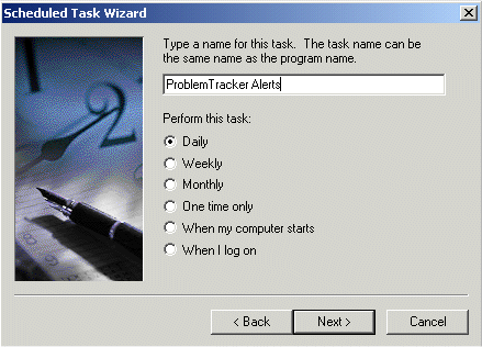 6. Enter a name for the scheduled task such as "ProblemTracker Alerts", then for the option "Perform this task:" select the radio button next to "Daily". Click Next to proceed.