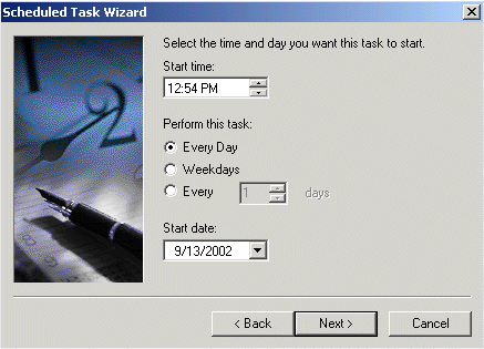 7. The current time will be displayed as "Start Time". For the "Perform this task:" option, select "Every Day". The current date will be displayed as "Start Date". Click Next to continue.