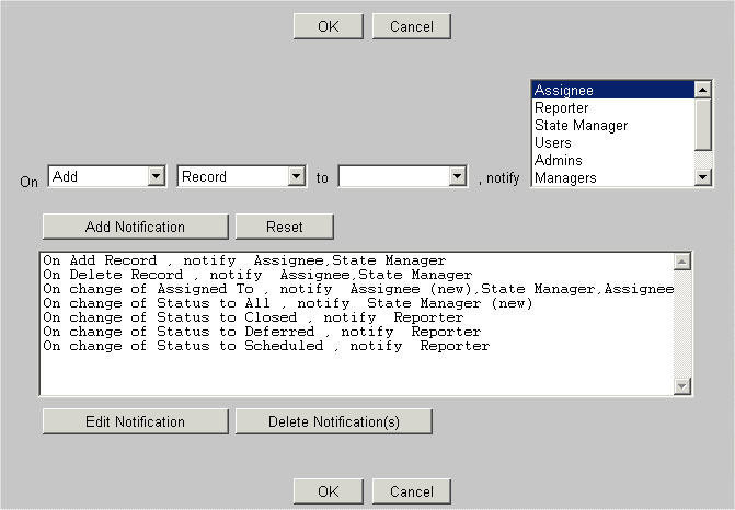 You can assign a manager to each state. This user will be notified of events at they occur, independent of whether they are currently assigned to the problem record. For example, the manager in charge of QA will probably want notification as problem records are changed to a state named "To Be Tested", and also as it is assigned to individuals while it is in this state. By selecting the QA manager as the manager for this process state, he or she will receive the desired notification. State managers are assigned under the "Define Workflow" option of the ProblemTracker Administrator page.