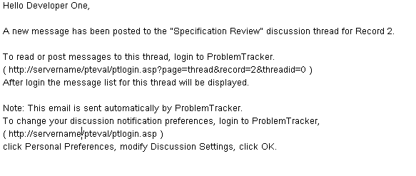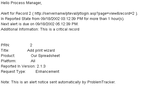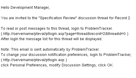Email notification messages can be generated automatically by ProblemTracker triggered by the Email Preferences you have configured for each product. Notification messages can also be triggered by the use of the Alerts and Discussion features. Each of the features above generates a notification message with a unique structure. The structure of each message type is described below.