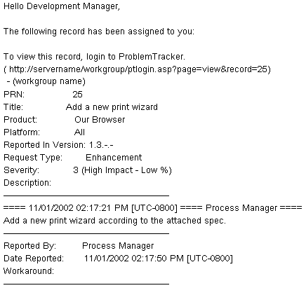The Email Preferences set for each product in ProblemTracker can be set to send an email message when an operation is performed on a record (such as adding, deleting, editing, or tasking a record) or when the record experiences a change in state or assignment. The email messages generated by these preferences are of the form shown int he example below. This example is a message sent to a user who has been assigned to a newly added record: