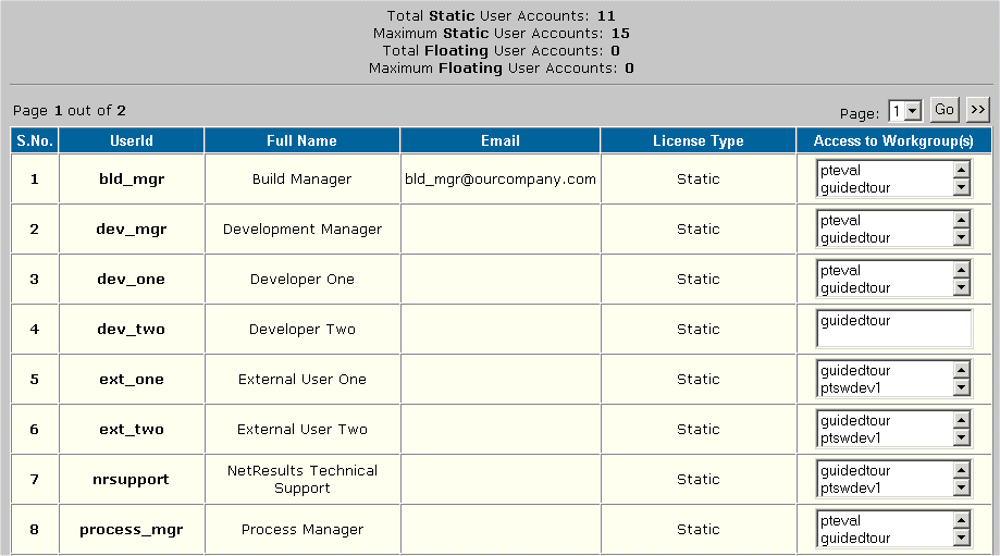 The table shows user profile information for all user accounts such as full name, email address, license type, and the workgroups which the user is allowed to access.