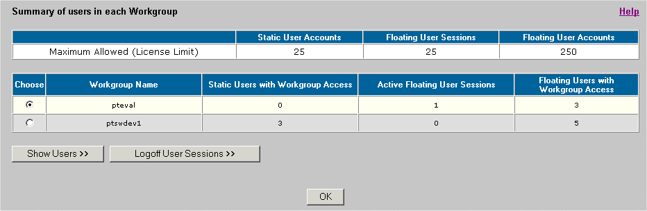 To see a list of active user sessions for a workgroup, select the radio button next to the workgroup,