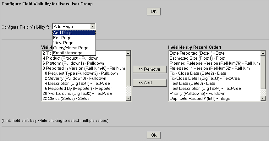 3. The fields that are visible to the user group will appear in the left column. In the right column, the fields that are "Invisible" to the user group are displayed. To make a field visible to the user group on the page(s) selected in the pulldown menu, click on the field in the right column, then click on the Add button. To make a field so that it is not visible to the user group on the page(s) selected in the pulldown menu, click on the field in the left column, then click on the Remove button. Multiple values can be selected by holding down the shift key while clicking on the values. Keep in mind that when you make a field invisible to a user group, the field will still be visible to users if this the field is configured to be visible to the "Users" group (since all users are members of this group). With this in mind, it is best to start by configuring the field level visibility options for the "Users" group, then proceed to configure the options for the remaining user groups.