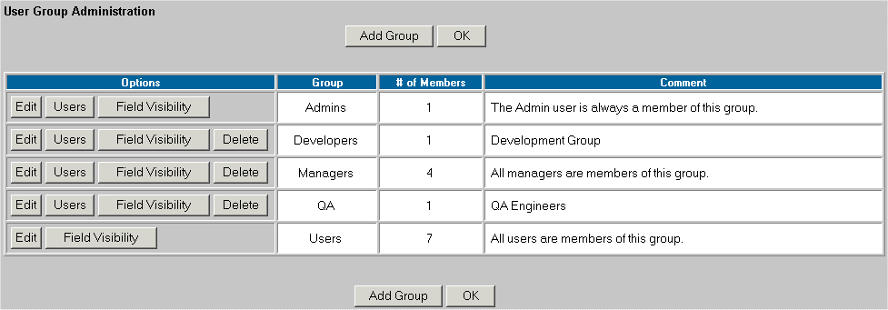 A user group is a collection of zero or more users. Each group is assigned rights and privileges to the system, and all members of the group inherit those rights and privileges. For example, any user that is a member of the Admins group inherits the ability to access the Admin features of ProblemTracker.