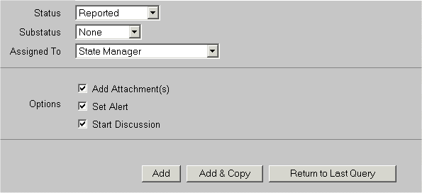 Depending on the privileges you have been assigned, you may see additional options at the bottom of the Add page such as "Add Attachment", "Set Alert", and "Start Discussion". These options are discussed in detail below.