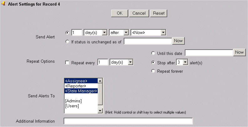 Depending on the product you selected, you may have the option to set an alert for the record you are creating. If you are allowed to set an alert for the record, the box "Set Alert" will appear at the bottom of the Add form. Check the box if you wish to set an alert for the record. After clicking the "Add" or "Add & Copy" button, the Alert settings will be displayed as shown below.
