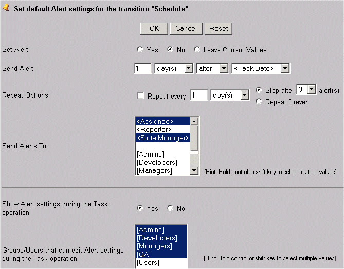 Alerts can also be configured for each transition in the workflow. With the necessary privileges, users can override these alert settings when moving a record to another state using the Task operation.